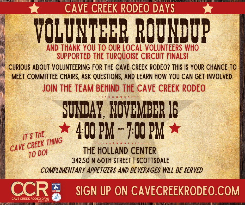 The Cave Creek Rodeo Days organization welcomes volunteers of all ages and encourages participation by all. Volunteers must be willing and able to withstand Arizona weather conditions as well as being prepared to stand for periods of time as required for certain volunteer activities. Volunteers who are under 18 years of age must provide parental consent to volunteer for the Cave Creek Rodeo Days events or activities.